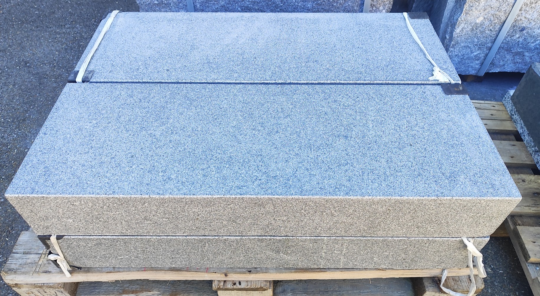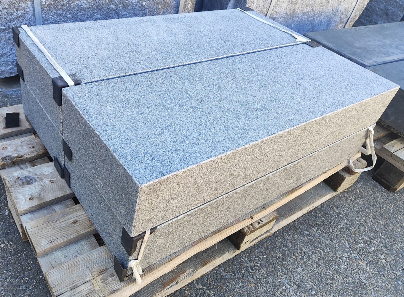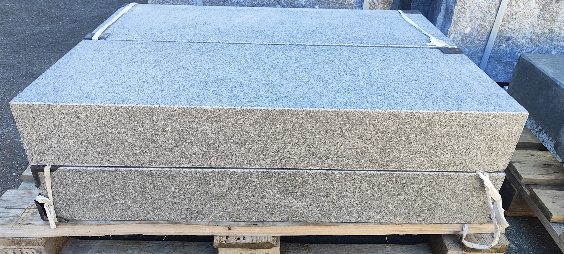 Granit/Diorit Padang dunkel (China)BlockstufenOberfläche geflammtStirnkante + 2 Köpfe geflammt100 x 35 x 15 cm