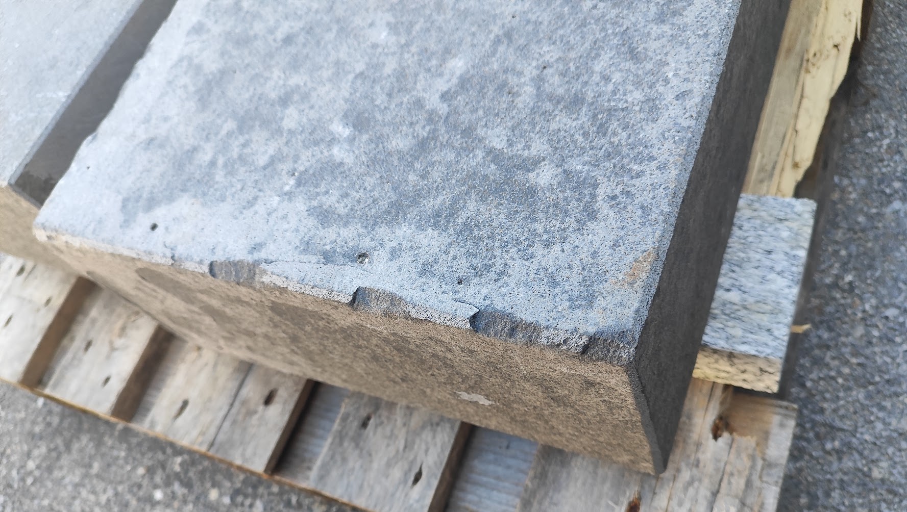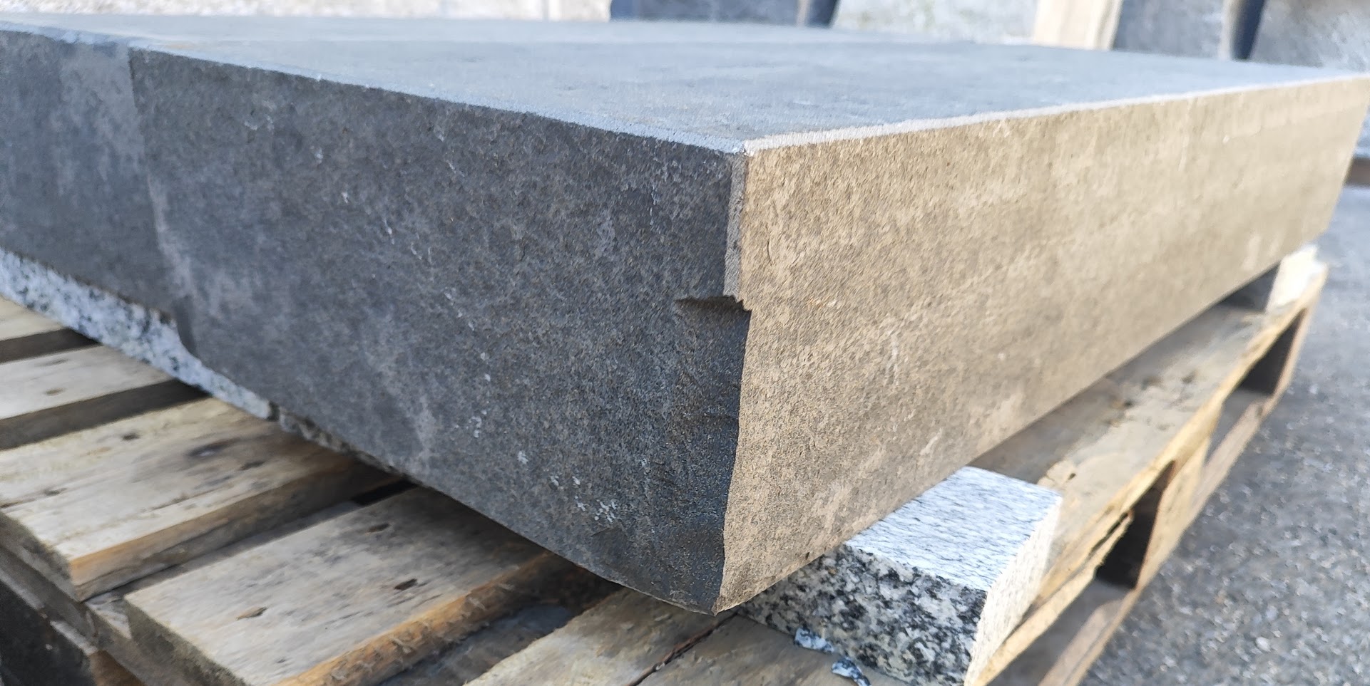 Basalt anthrazit (Vietnam)BlockstufenOberfläche geflammtStirnkante + 2 Köpfe geflammtKanten + Ecken mit div. Beschädigungen (siehe Fotos)100 x 35 x 15 cm